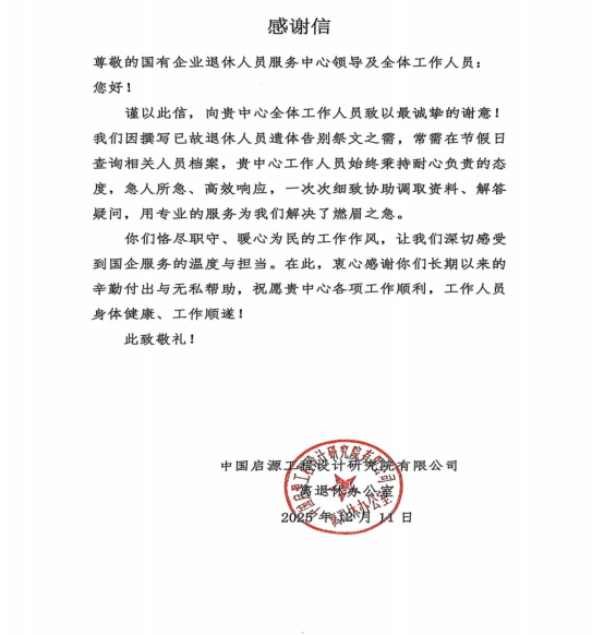 不仅如此,中国启源工程设计研究院有限公司离退休办公室也特意发来感谢信。因撰写已故退休人员遗体告别祭文,常需在节假日紧急查询档案,西安市国有企业退休人员服务中心工作人员始终秉持耐心负责的态度,急人所急、高效响应,一次次细致协助调取资料、解答疑问,用专业服务解决了燃眉之急,让企业深切感受到国企服务的温度与担当。